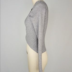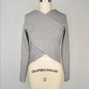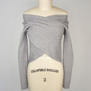 Cropped Crisscross Ribbed Knit Top. Brand New, NWT! Wear it off the shoulder too! 51%Viscose 28%Poly 21%Nylon. (Length:15” Front, 18.5” Back based on size Small) Color: Gray.