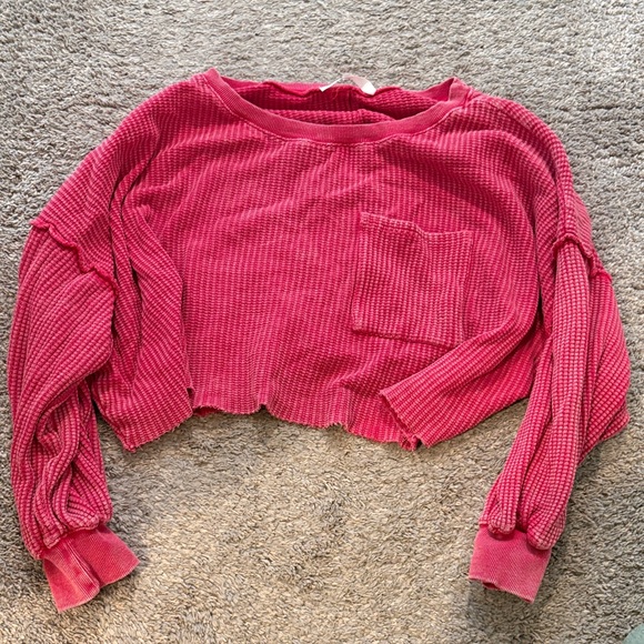 Soft ribbed texture with a cropped silhouette. Featuring long sleeves and a small chest pocket for subtle detail. Vibrant raspberry pink color adds a feminine pop to casual outfits. Lightweight and comfortable for everyday wear.