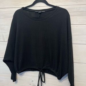 Cropped right at/below belly button. Tie around waist.