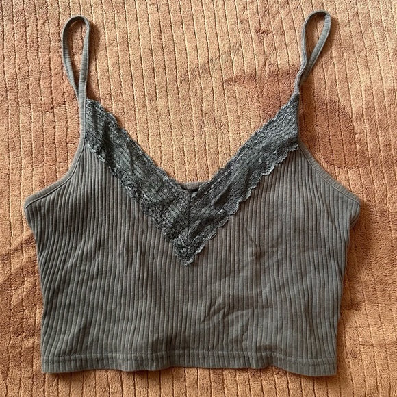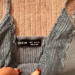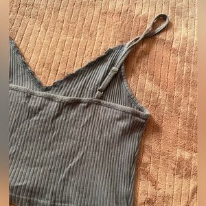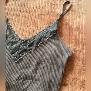 Ripped ribbed tank top with adjustable straps and cute lace detailing. Soft fabric for everyday comfort. It’s a mix between blue and gray. Worn but in great condition!