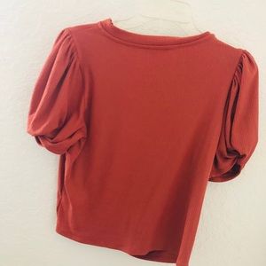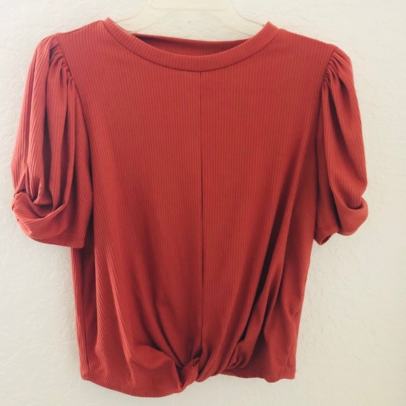 Has the puffy sleeves. A knot at the bottom of the front. Pretty much new. Haven’t wore it.