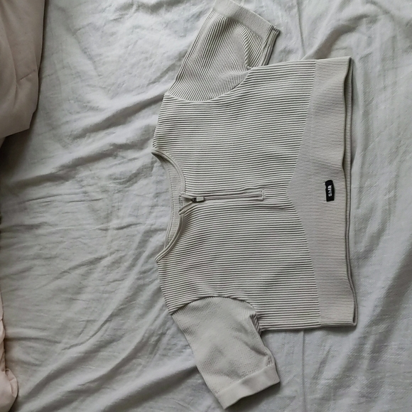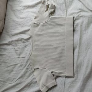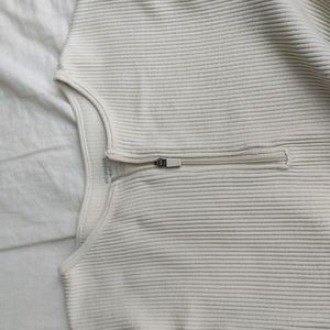 a tight fitting but not too tight, stretchy. accentuates the chest area, a zipper in the middle. the zipper does not easily fall when placed anywhere you like, it stays in place.