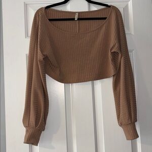 Stylish tan ribbed sweater with balloon sleeves. Perfect for casual outings. Can be worn off shoulder