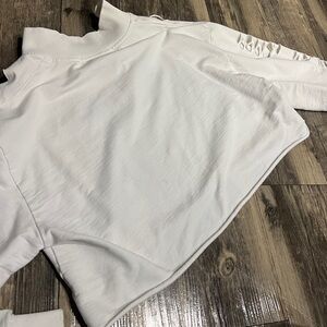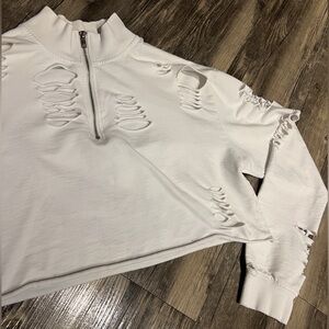 Emma & Sam cropped sweater with rips all along the sleeves & front of the sweater. Light material & short crop cut!