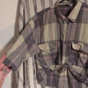 Super cute. Neural greens with a purple/pink strip. Slightly cropped & I choose to tie it but can be worn down