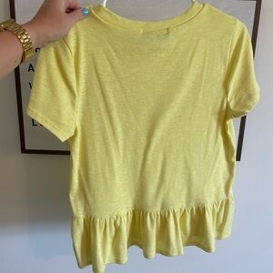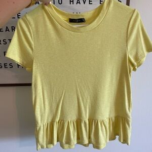 Ribbed, yellow material that fits right above waistline (not completely cropped) Size small, but fits most mediums