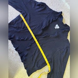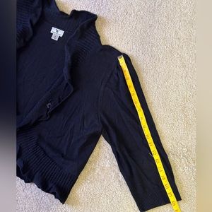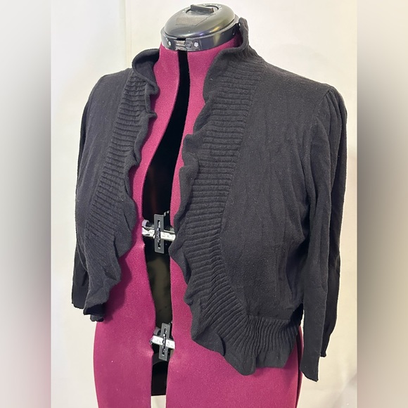 Sweater shrug with ruffle edge detail. Hook closure. Normal wear and price reflects that. Still is jet black (camera just struggles to catch the true black).