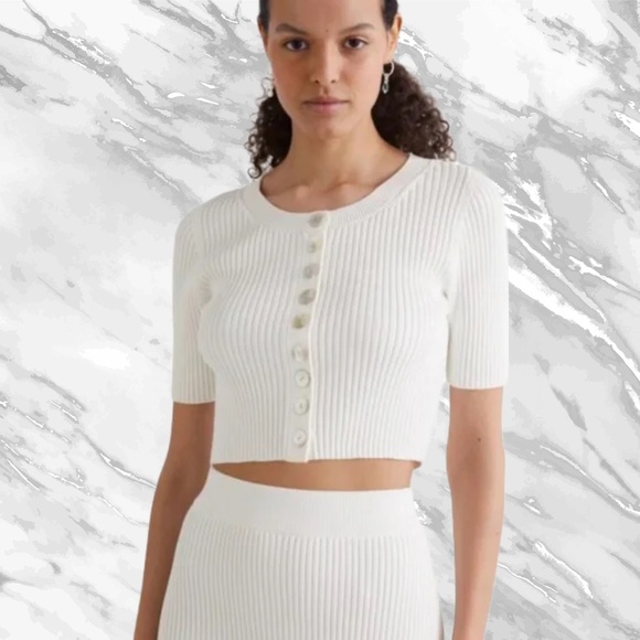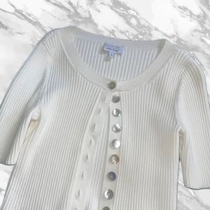 White, mid sleeve rib knit cardigan with a cropped silhouette adorned with iridescent shell button closures. Totally SOLD OUT online!