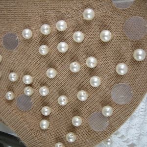 Stunning vintage taupe-colored crop top cardigan that ties in front. Hand sewn pearls and other embellishments.