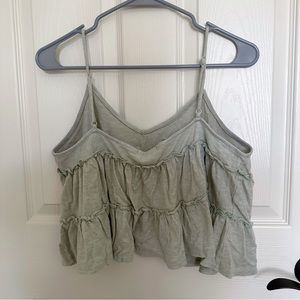 This tiered tank was purchased at a boutique in Lake Geneva, making it almost one-of-a-kind! It was a closet staple of mine for years and is a bit well-loved, but I’ve grown out of wearing crop tops a bit and decided to sell. It’s a beautiful soft cotton fabric and a subtle sage green color with adjustable straps!