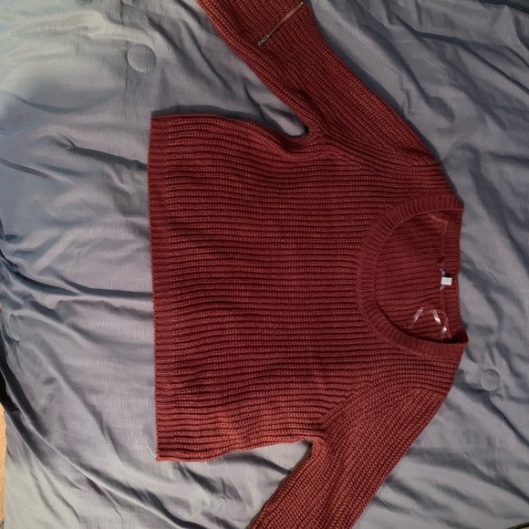 This sweater is adorable! It is cropped right above the belly button. It’s a perfect fall rust color and has cute zippers on each arm! Its comfy but just doesn’t fit me anymore!