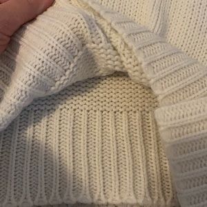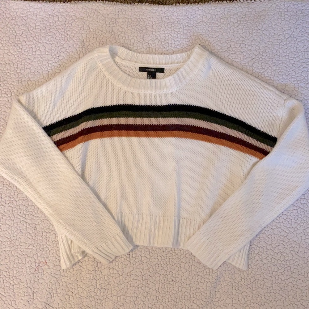 White cropped sweater with a black, green, pink, brown, and orange pattern spread across.
