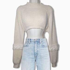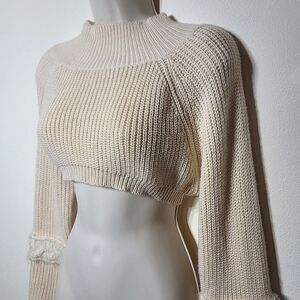 Cropped Sweater Cream Long Sleeve High Neck Sweater;