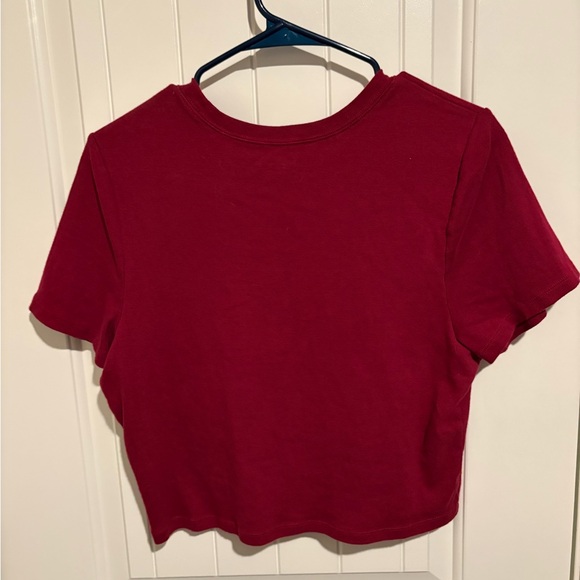 Short sleve cropped burgundy T-shirt. I sized up for comfort to a Juniors XXL.