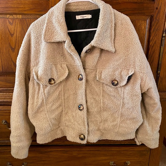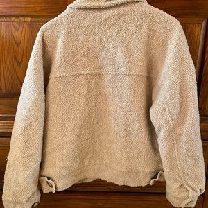 Super cute cropped teddy jacket! Not too cropped, not too long. Slight oversized boyfriend fit. Two big breast pockets. Big tortoise buttons on pockets, middle, cuffs and back (all pictured). Neutral tan color makes it easy to pair with any outfit! $10 OBO
