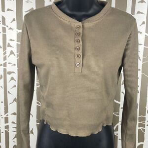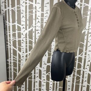 Additional Details: Lettuce edge trim on hemline and sleeves, half button front.