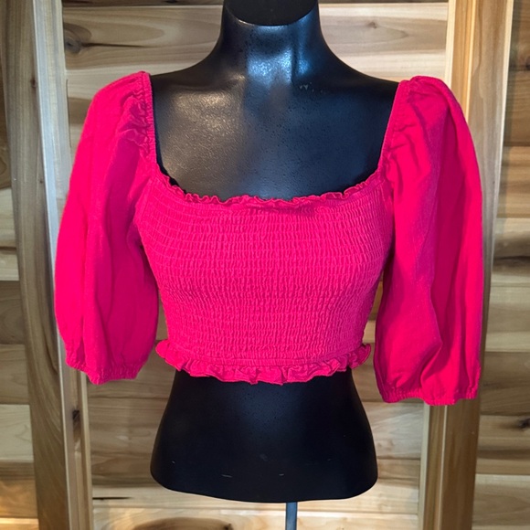 This is a very cute cropped top with a stylish back. It is more on the reddish color.