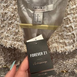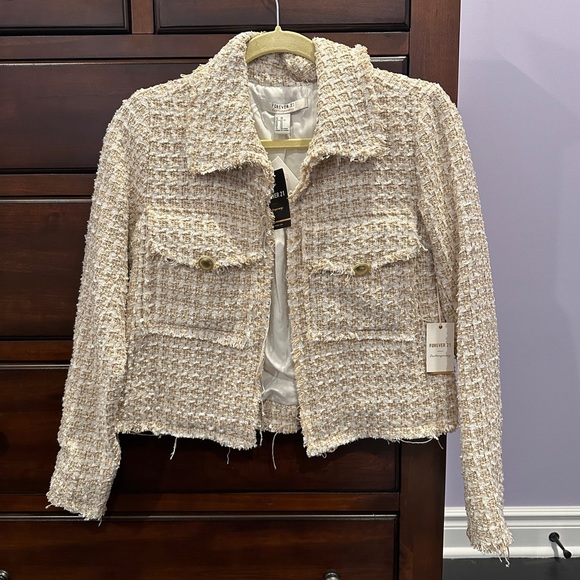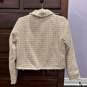 Brand new tweed jacket with frayed detail on the edges and a slight sparkle/shimmer woven throughout.