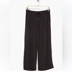 Cropped Wide Leg Pants. Features a comfortable elastic drawstring waistband in breezy style. Front slant pockets. Inseam is 25.5”.