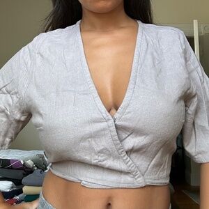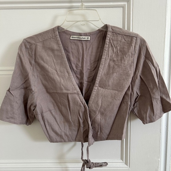 Cute lavender/gray cropped wrap shirt from Abercrombie. Wraps and ties in the back with a clasp in front. Used in great condition.