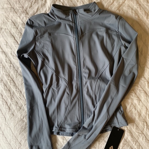 Super cute light blue slightly cropped athletic jacket. Hits right below the belly button and just a tad too small for me since I have broad shoulders. Size medium but runs small so this would fit a size Small!