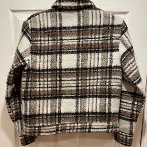 Women’s cropped plaid jacket in great condition. Great for layering on cooler days/nights. Dress up with black wide leg pants or dress down with jeans.