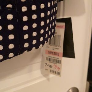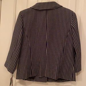 Navy blazer with white dot design. Cropped flare shape with 3/4 sleeves. Three large buttons on front. Fully lined.
