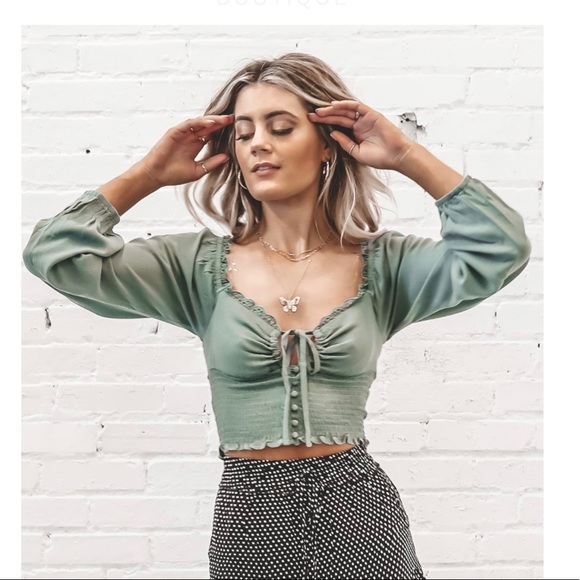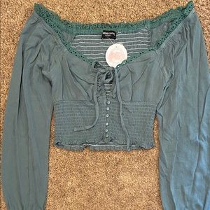 New with tags. Beautiful sage/forest green colored cropped blouse with lace detail and flowey sleeves