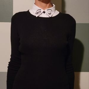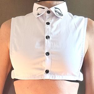 Embroidered eyes on collar.
