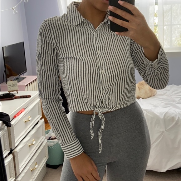 Gray stripes, cloth material, tie knot on the front, button down, collared