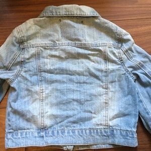 A cropped denim jacket in a light denim wash. Worn twice. Has two pockets. Buttons. And looks great with crop tops. No damages. Has been sitting in storage for awhile which is why it's a bit wrinkly.