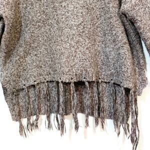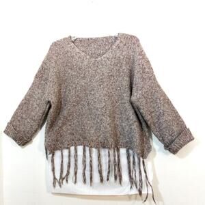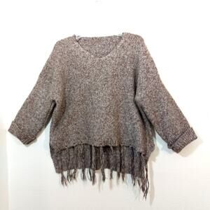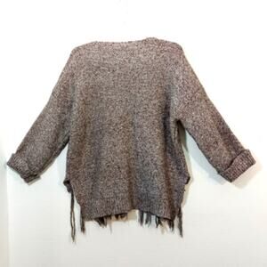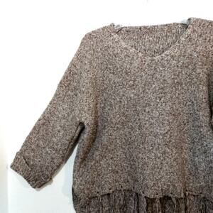 Thick knit cropped boxy fringed front high low oversized pullover sweater with cuffed 3/4 sleeves