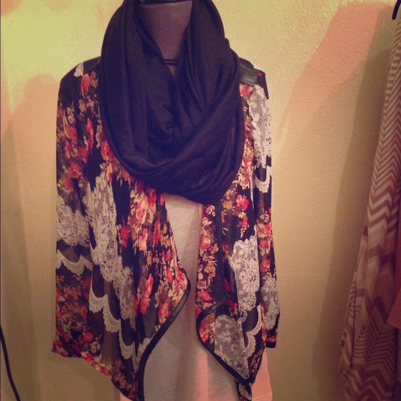 Black cropped jacket with floral print and leather trim