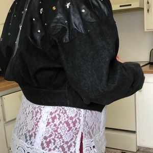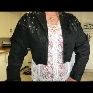 Adorable cropped western cotton jacket with genuine leather trim. Rhinestones align the jacket making it very unique and stylish. This jacket has only been worn about 10 times. There are no missing stones.....