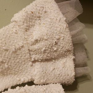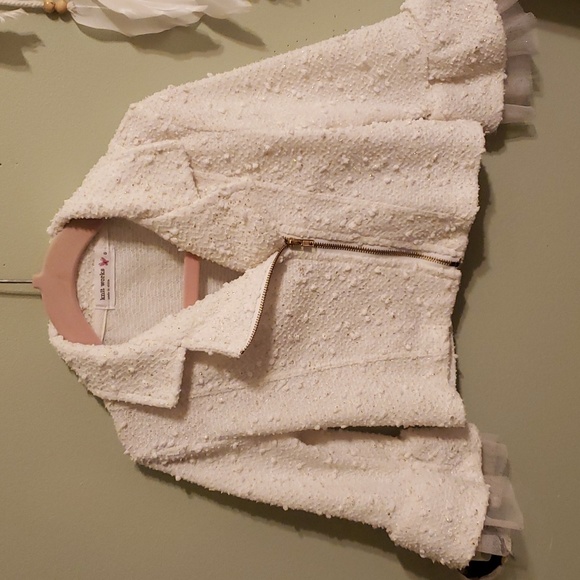 cream and gold speckled little girls cropped jacket. Flared sleeve with tulle. Can dress up or down