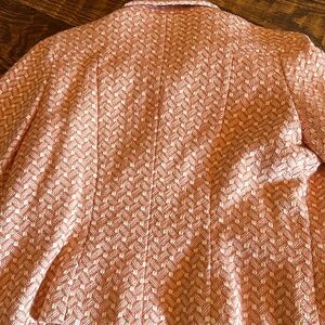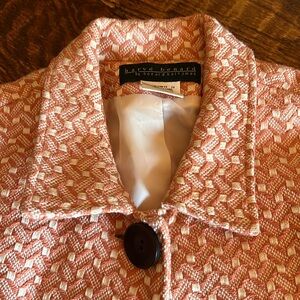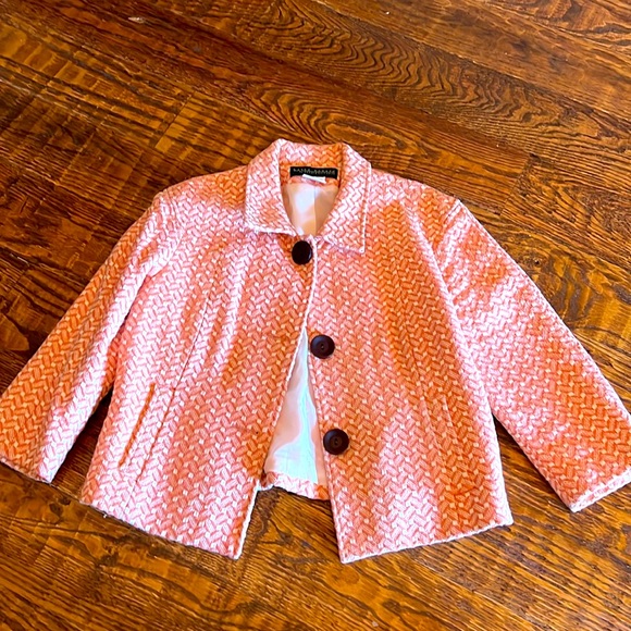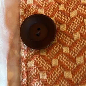 Dress or casual jacket that hits at the waist with 2 front useable pockets with large 3 wooden buttons down the front