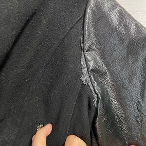 Sleeves have been fixed and replaced before in an effort to be sustainable . You can see some gaps and also has some I fished seams I side where the sleeves join the bodice. Hood is detachable. Cropped feeling. Cannot tell what size it was originally but I would say a small or even an xs.