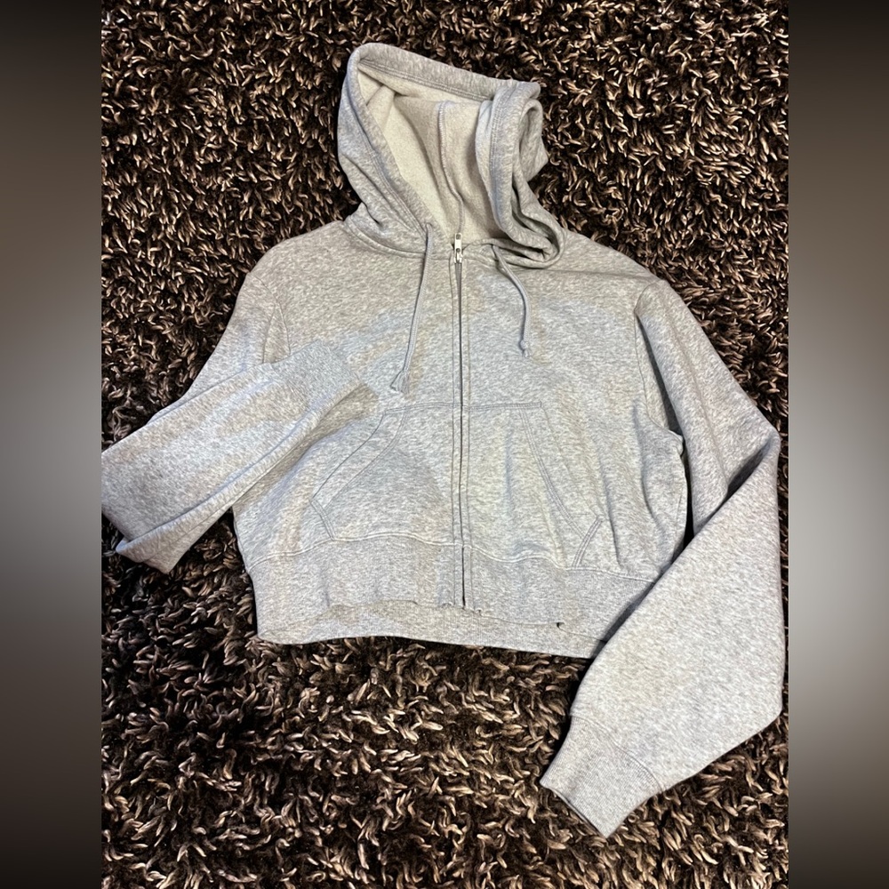 Stylish gray zip-up hoodie with a cozy hood and front pockets. Perfect for casual wear.