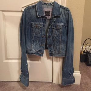Cropped Jean jacket that is super cute with spring dresses with the sleeves rolled to three quarter length. There are white bleach spots to the right arm but were there when I bought the jacket (the Abercrombie and Fitch typical)
