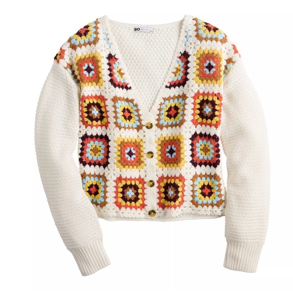 SO brand patchwork square colorful cardigan. Cropped but not too short. Size M. All measurement while laying flat. Chest 20”, Length 20”, sleeve shoulder to cuff 21”. Pet free/smoke free home.