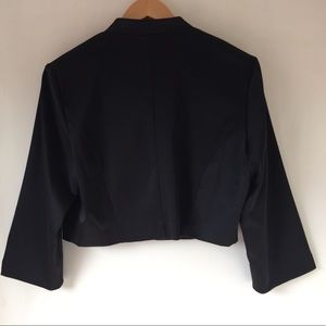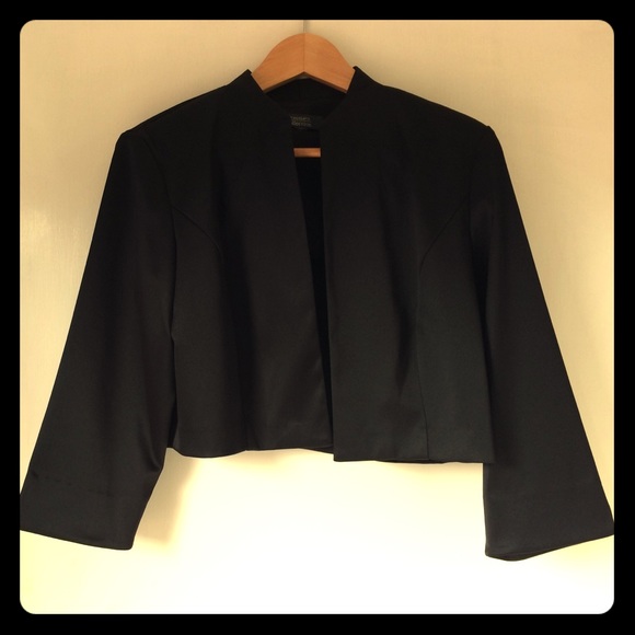 Short cropped satin like jacket to wear over a dress or blouse. Can be dressed up formal or down played over slacks. Classy layer over fancy dress for colder nights. Simple and elegant. 97% polyester, 3% spandex. New condition, worn once to party.