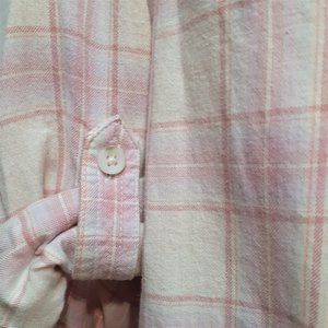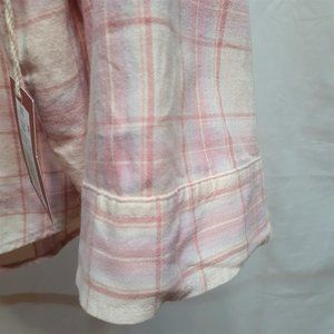Light pink and beige plaid shirt, cotton blend cropped blouse. Plaid shirt with roll-up bottom attached sleeves.
