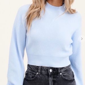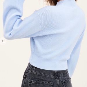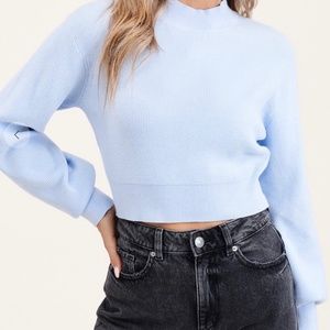 Color is sky blue. 50% Visose, 28% polyester, 22% nylon. New with tags. also available in S, M , L. Model wearing size Small for reference.