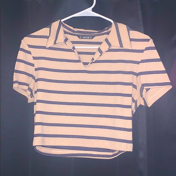 Striped tan and dark blue crop top with a collar. Absolutely love this shirt!