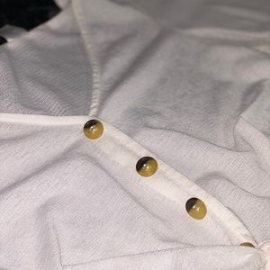 Short top in airy, crinkled jersey with a V-neck, decorative buttons down the front and short, wide sleeves. Narrow, covered elastication and a tie detail at the hem.
