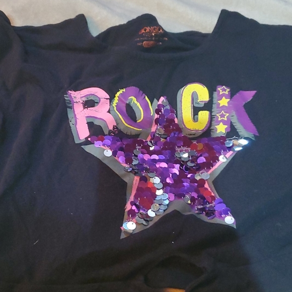Rick star sequin top,black top with pink purple yellow gray colors, purple silver sequins,ties at waist Large (10/12)