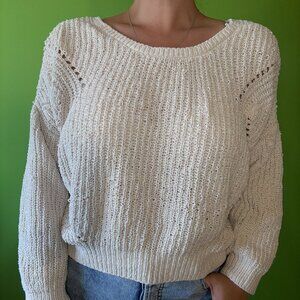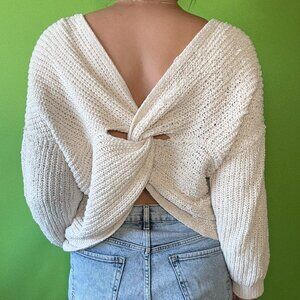 Very cute cropped cream knit sweater with a twist on the back. Oversized fit (can also work for an Extra Large). Looks great with jeans.