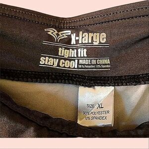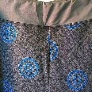 Nice pattern on these stay-cool leggings in tones of light grey, dark grey and bright blue. Dark gray 2" waistband. Poly/Spandex. NWOT