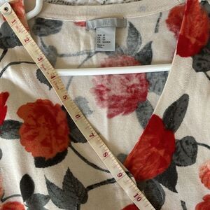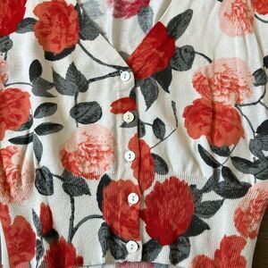 Cropped floral sweater with red/orange flowers and a v neck on the front. 5 buttons. Sleeve length and v neck measurements in pics.