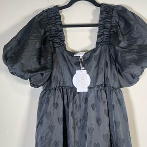 Wear your heart all over in this gorgeous lady day dress! With its unique dancing hearts print, this special black dress will have you feeling glamorous and draw everyone's eyes over to the most stunning fashionista in the room. Dress features a square neck, puff sleeves, functional pockets, and heart embossed fabric.